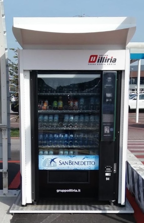 differenziata di bicchieri, bottiglie e cucchiaini, colonnina con ricarica telefono, erogatore dell’acqua e modulo con forno a microonde. impianto di illuminazione a STRIP LED (14,4 - 24V) realizzato secondo normativa, il colore di serie fornito è il nero RAL 9005 ed il bianco RAL 9016 è possibile comunque personalizzare ogni struttuta con marchi e loghi aziendali.