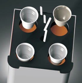 La parte superiore per garantire stabilità e solidità del prodotto è realizzato in lamiera con spessore 4 mm a cui sono ancorati i tubi impila bicchieri da 100 pezzi ognuno con una capacità massima di 400 o 600 pezzi.I tubi porta bicchieri sono in PVC e vengono fissati a caldo sul basamento su una sede troco conica per garantirne la solidità.